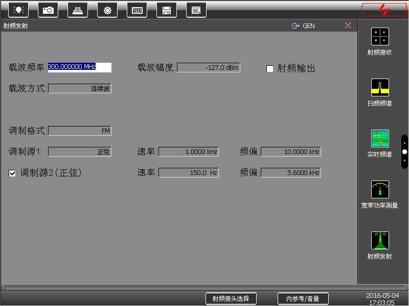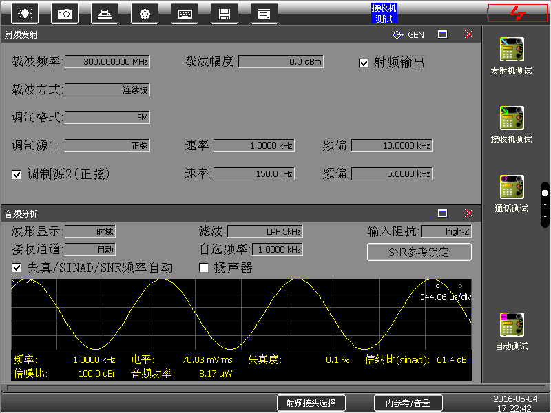 模拟制式通信测试:AM、FM、SSB信号发生与解调分析。具备解调音频的图形化显示、SINAD、SNR、失真度、调制率等测量功能,并内置扬声器,可实时输出解调话音;调制信号发生调制源支持外音频、麦克风;