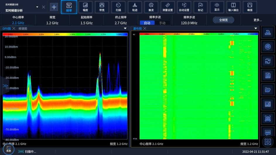 Ceyear 4082系列信号/频谱分析仪提供10MHz/40MHz/200MHz/400MHz/600MHz/1.2GHz/2GHz共7种带宽配置选择,满足宽带雷达、5G NR、WLAN等不同测试应用场景使用需求;提供100Hz~1.5GHz任意采样率IQ数据流,采样率设置分辨率优于0.1Hz,全带宽频率响应实时补偿,可支持多种速率的信号测量分析;提供1.2GHz带宽的实时频谱分析,100%截获概率(POI)信号最短持续时间优于0.28μs,可用于脉冲信号、毛刺信号、间歇性信号等各种瞬态突发信号的捕获测量。